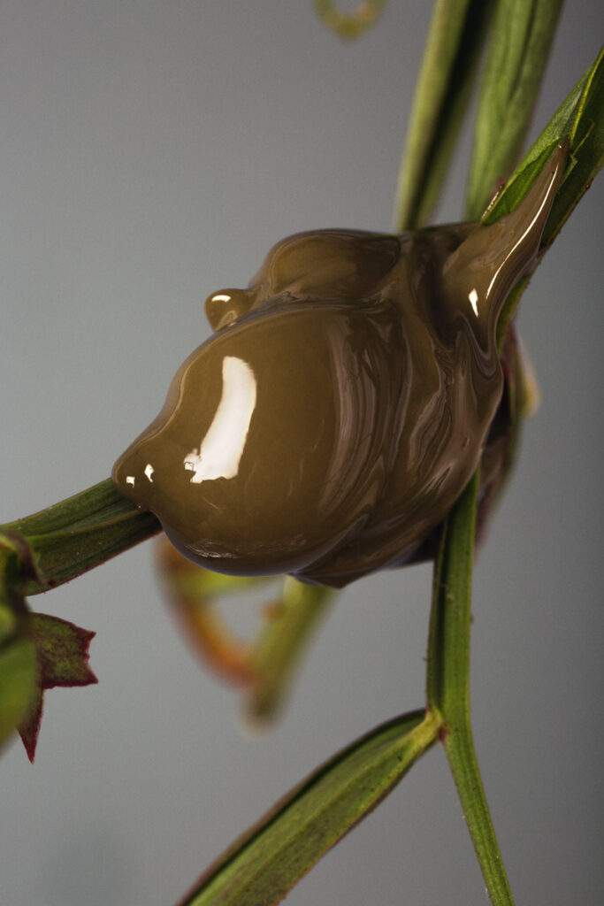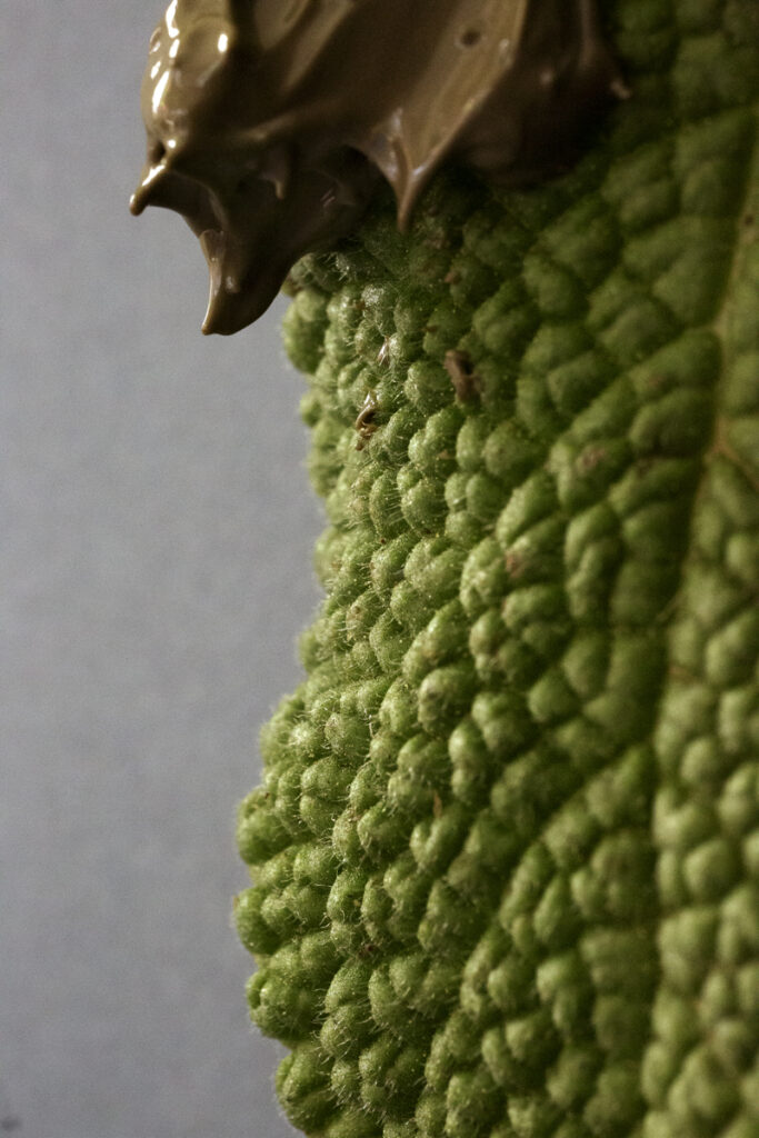 BetaBlastoCuir (Quimera) is a work that appeals to another imagination. One of its core elements are images that the artist composes from the encounter between a series of plants (some selected for curative properties related to the female body) and a healing paste that is used to repair damaged leaves or trunks. This encounter between the supposedly natural and the supposedly artificial undoes the sublimation of the organic as a perfectly autonomous system and at the same time generates a disturbing viscerality that, like vertigo, attracts and repels in equal measure. From the micro to the macro, a game of scales interrupts the immediacy of the relationship between image and referent and conjures representations of the interior of the body or of microorganisms. This half-natural, half-artificial creature mirrors what Sarah Franklin has called a cyborg embryo and transbiology insofar as the technological and the biological come together.»